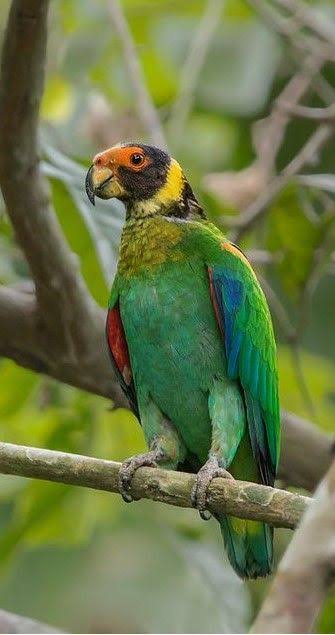 The South American parrot Gypopsitta vulturine, Bristlehead or commonly known as the vulturine parrot, is described to have a short and squarish tail that has the colors of green plumage and tinged blue. They are called the bristle head because the anterior part of their head doesn’t have feathers and that the feathers on the neck part are bristlelike. The adult and juvenile do not have significant changes in terms of their physical appearance. The adults tend to have a general color of green with hints of yellow and brown in their forehead and chin, black colorations that covers their ears, yellow or olive colorations on their upper breast, a combination of red and orange on their wings and have a black border on the nuchal collar.
